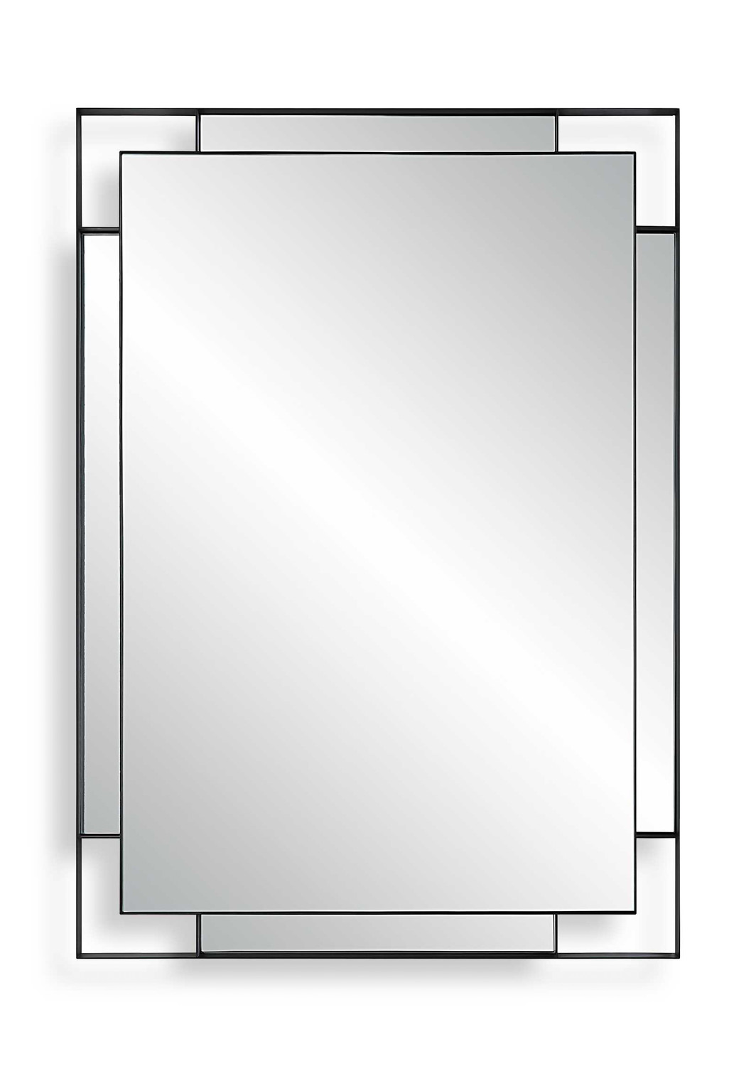 - The Stellan Mirror Features A Strap Style Frame Finished In A Sleek Matte Black Surrounding A Floating Polished Edge Mirror With Accompanying Side Mirrors For Added Visual Dimension.