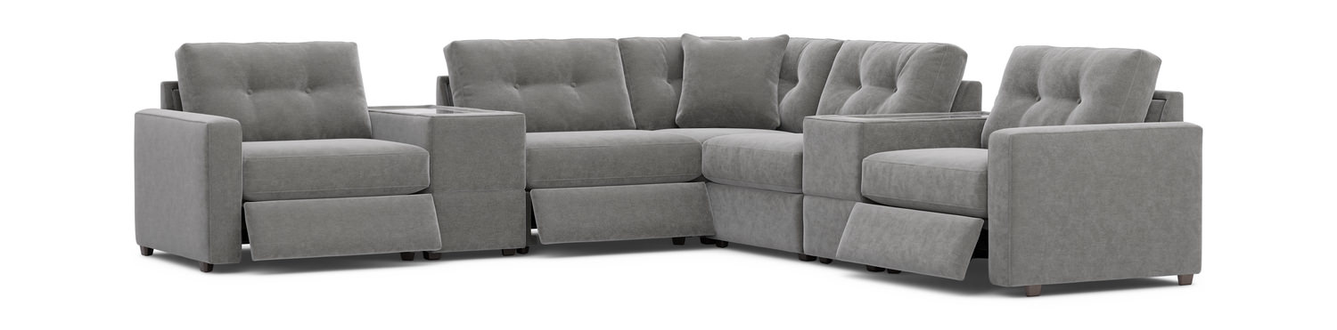 Introducing the ModularOne 7 Piece Sectional With 3 Power Reclining Chairs. Elevate your living space with this modern and versatile sectional, perfect for those seeking both style and comfort. Crafted with an engineered and hardwood frame, this sectional boasts durability and long-lasting quality. The high resiliency foam cushions provide a plush and supportive seating experience, while the steel spring suspension ensures a sturdy foundation. Custom order this sectional in four additional colors to suit your personal style and décor preferences. The fully padded frame offers enhanced comfort, making it the ideal spot to relax and unwind after a long day.