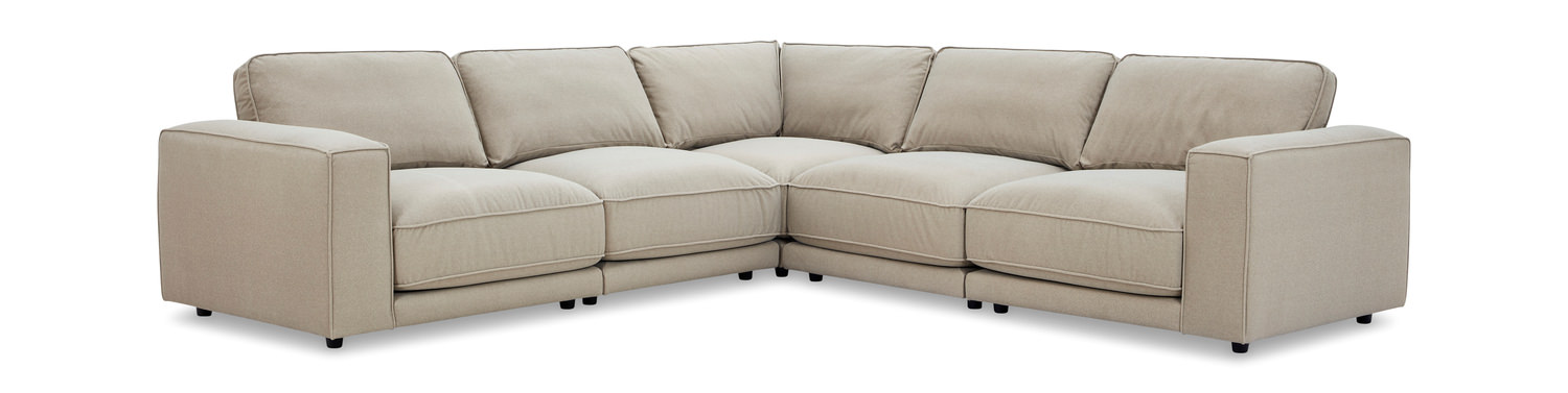 Introducing the Tiffany 5 Piece Modular Sectional from HOM Furniture, a perfect blend of comfort, style, and versatility. Crafted with an engineered and hardwood frame, this sectional offers unparalleled durability and stability. The high-resiliency foam cushions provide exceptional comfort and support, ensuring a cozy seating experience for you and your guests. Designed for convenience, the Tiffany sectional features steel spring suspension for added resilience and longevity. With a casual yet transitional style in a timeless beige color, this sectional effortlessly complements any decor. Whether you're lounging with family or entertaining friends, this stationary sectional is the ideal centerpiece for your living space. With simple assembly required and custom order options available, you can tailor this piece to fit your space perfectly.
