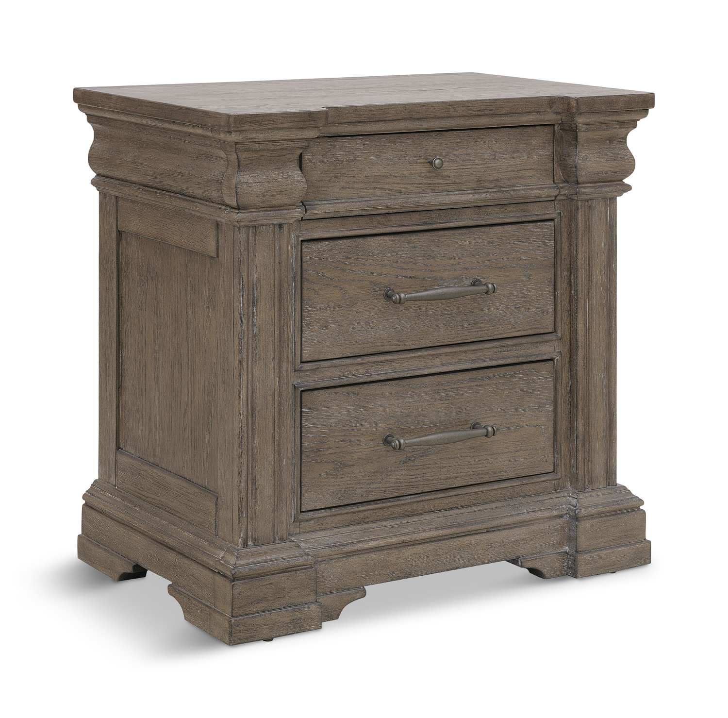 The Cascade Nightstand features 1 small top drawer with removable felt lining, removable cedar lining in the bottom drawers, and a convenient USB charger on the back. Flat-cut oak solids and veneers have a beautiful finish, which adds warmth to this collection. English dovetail, full height, and fully finished drawers have full extension ball bearing guides and are dust-proofed below for heirloom quality. Solid, custom hardware has an antique silver finish.