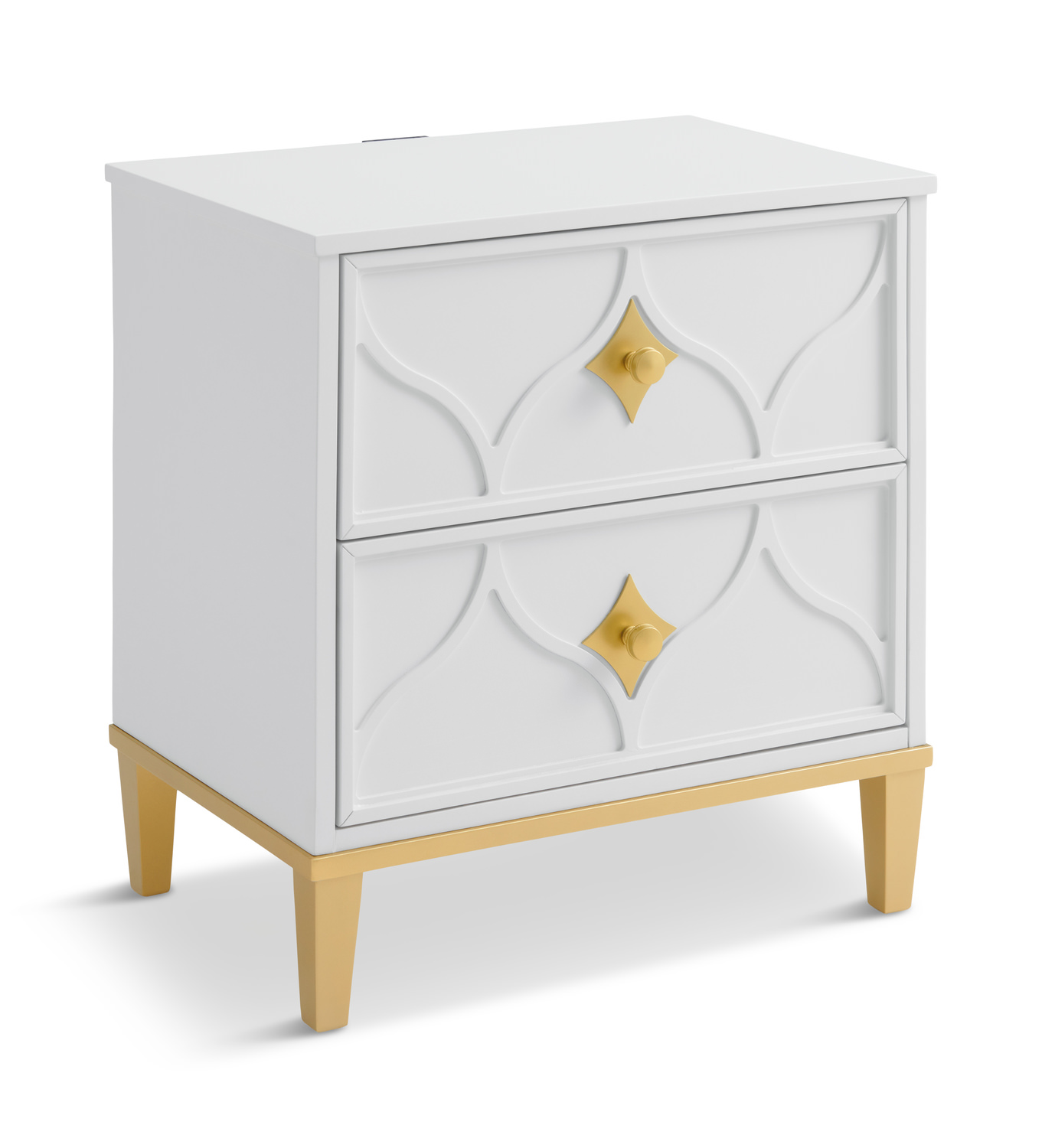 Introducing the Emma Jayne Nightstand by HOM Furniture! This elegant piece combines the timeless charm of traditional style with modern functionality. Crafted from poplar solids and veneers in a stunning white with gold accents, this nightstand exudes sophistication. The English dovetail drawers and roller ball bearing steel drawer glides ensure smooth and durable operation, while the built-in USB charger adds convenience to your bedside. Made from high-quality poplar wood and veneer wood materials, this nightstand is both sturdy and stylish.