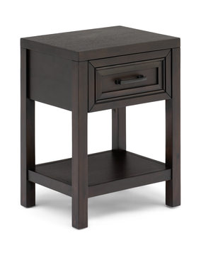 The Viggo Nightstand has a modern look with a perfect size to fit into any space. There is one drawer that has full extension, a ball-bearing drawer glides, and the bottom of the drawer is lined in felt. The black metal handle has a squared-off design to add to the modern touch. The straight lines in the legs lead down to an open shelf.