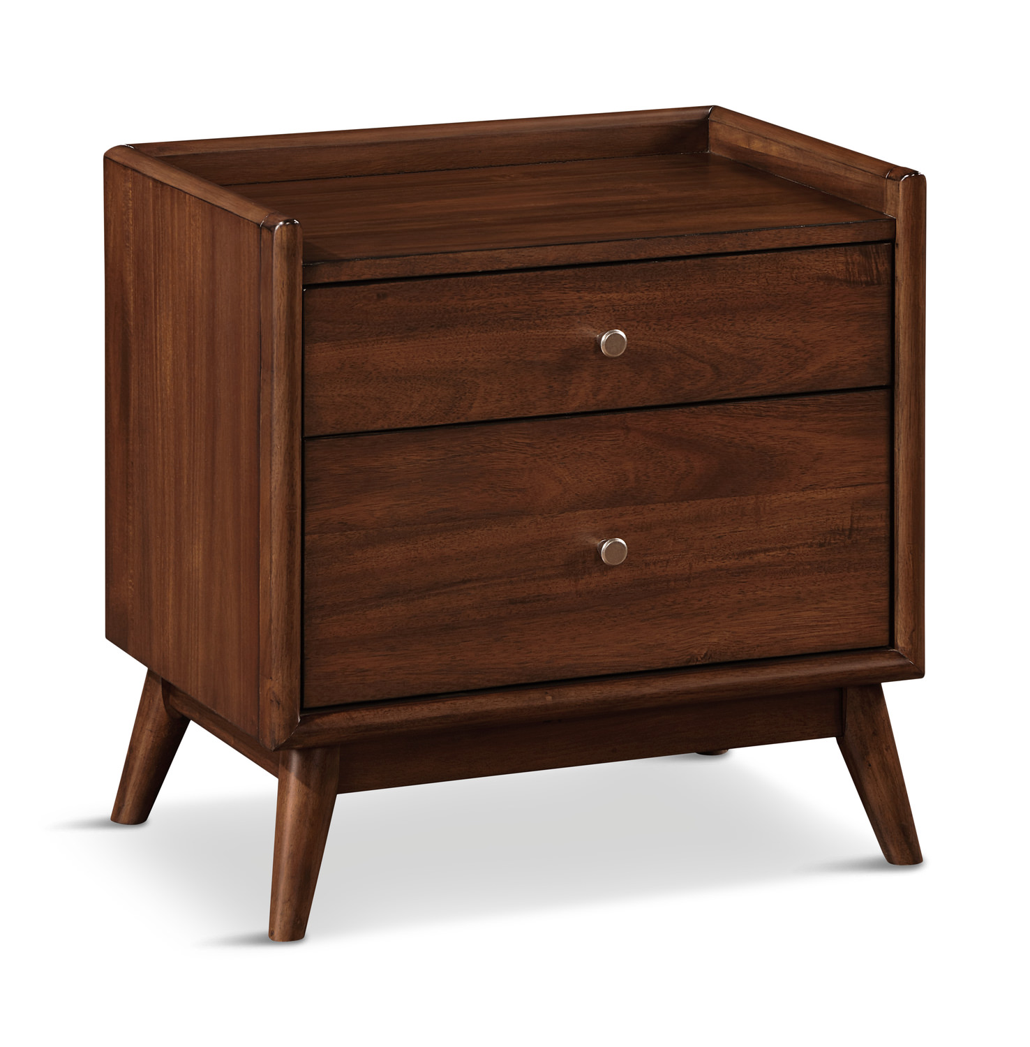 The Wexler Nightstand for the Uptown Gallery, where Mid-Century Modern meets functionality and style. This sleek nightstand features a beautiful medium brown finish, complemented by flared legs for a touch of retro charm. Crafted from solid rubberwood with acacia veneers, this nightstand is built to last for years to come. The Wexler Nightstand is not only stylish but also practical, with soft closing drawer glides that ensure smooth and quiet operation. The top drawer is felt-lined to protect your delicate belongings, while a convenient USB port on the back lets you charge your devices while you sleep.