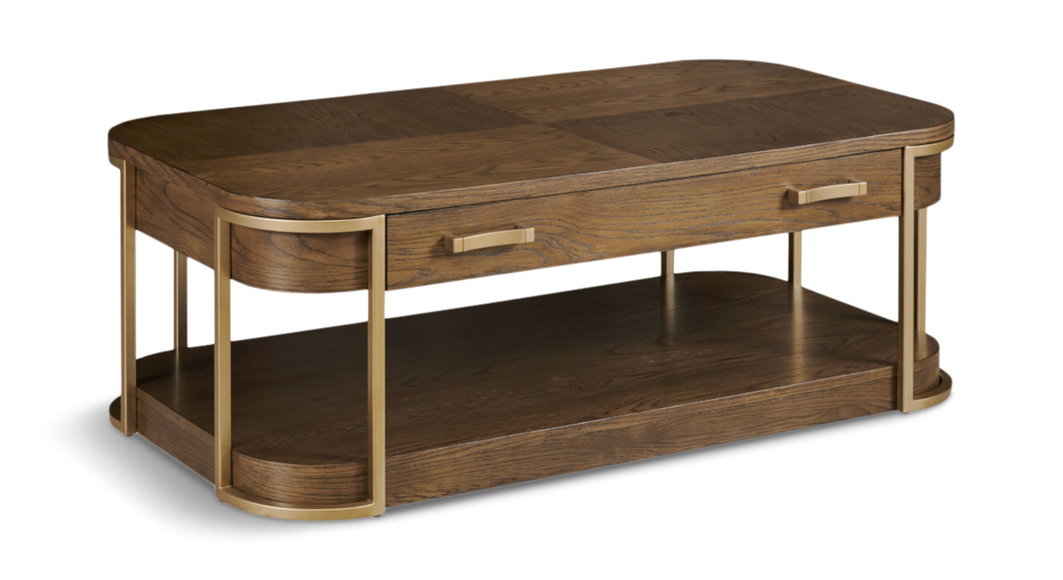 Add a touch of elegance and sophistication to your living space with the Agatha Coffee Table from HOM Furniture. Crafted with impeccable attention to detail, this exquisite piece features soft corners and curved legs that exude timeless charm. Made of premium split heart cathedral white oak with champagne metal accents, the table is a true statement of luxury. The soft close drawer and stationary shelf offer convenient storage solutions, while the parquet top in a rich spice color adds a touch of warmth to your decor. Embracing a traditional style, the Agatha Coffee Table is perfect for those who appreciate classic design with a modern twist.