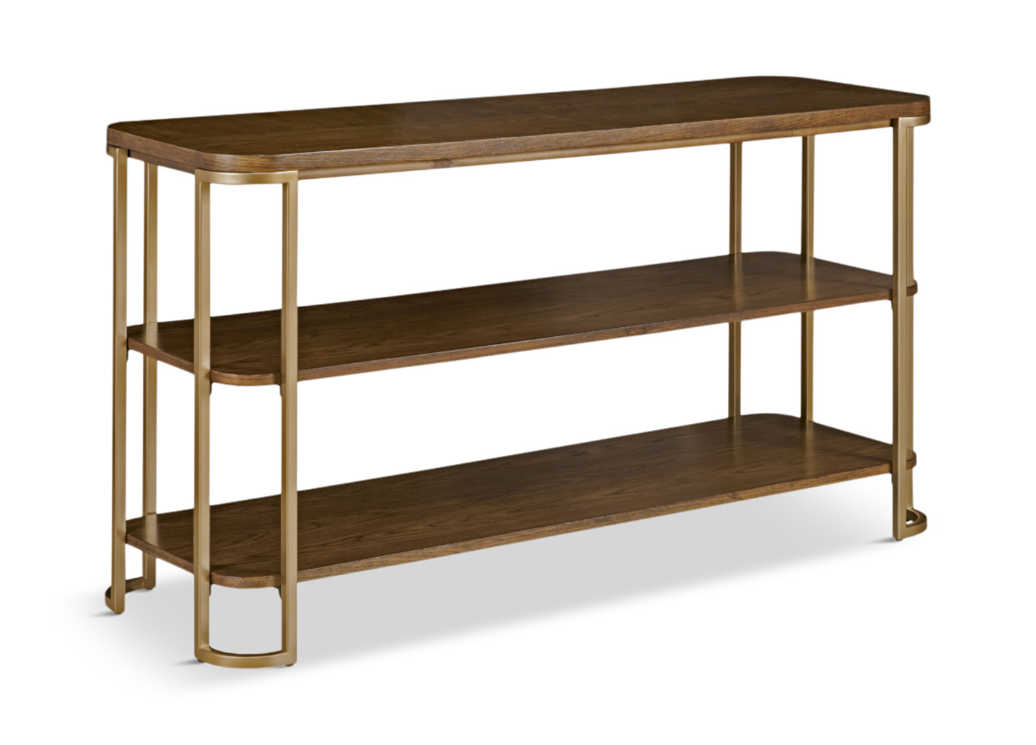 Immerse yourself in luxury with the Agatha Sofa Table by HOM Furniture. Crafted with exquisite attention to detail, this stunning piece features soft corners and curved legs, adding a touch of elegance to any space. Made of split-heart cathedral white oak with champagne metal accents, the table exudes sophistication and class. The shelves offer convenient storage options, while the parquet top in a spice color elevates the traditional style to new heights. Bring a touch of refinement to your living room with the Agatha Sofa Table from HOM Furniture.