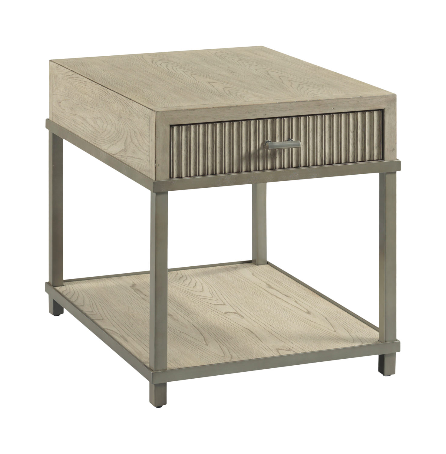 The Bailey End Table has a great combination of style and function.The wood shelf, metal frame, aged nickel hardware and concave detail in the panel face are great visual features. One soft close drawer hides away your belongings.