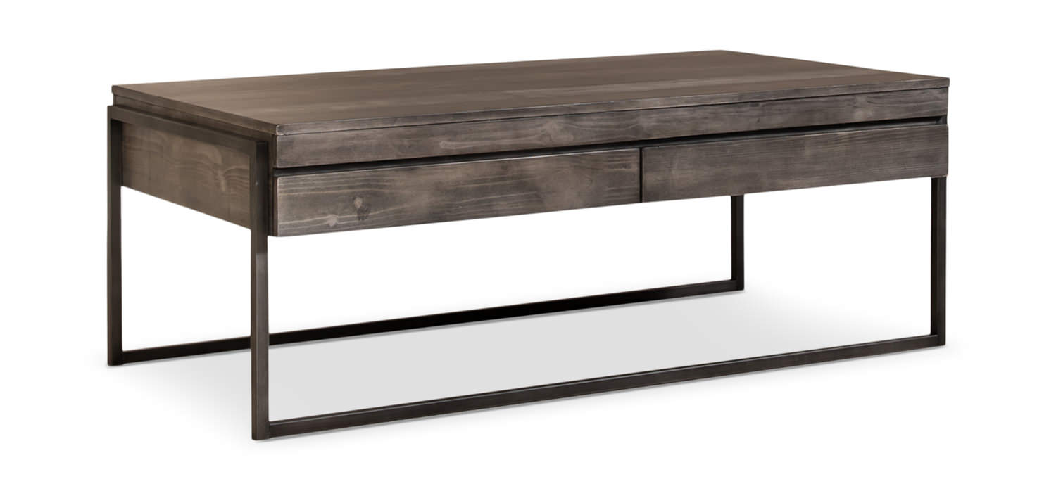 The Casper Coffee Table has a weathered grey finish and a casual design that will go beautifully with any living room set. The Top is made of pine veneers and solid pine hard wood paired with a powder coated metal on the base. There are groove lines on the top to create a rustic plank look. This table features two drawers with metal glides that make great storage for remotes and magazines. The Casper tables will fit well with all different styles of furniture.