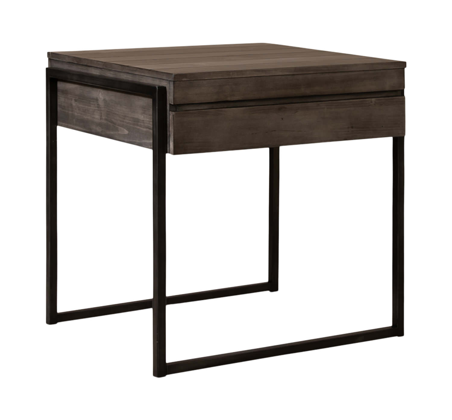 The Casper End Table will fit well with all different style of furniture with the weathered grey finish. The top is made of pine veneers and solid pine hard wood paired with a powder coated metal on the base. There are groove lines on the top to create a rustic plank look. This table features a drawer with metal glides that make great storage for remotes and magazines. The Casper End Table casual design will go beautifully with any décor.