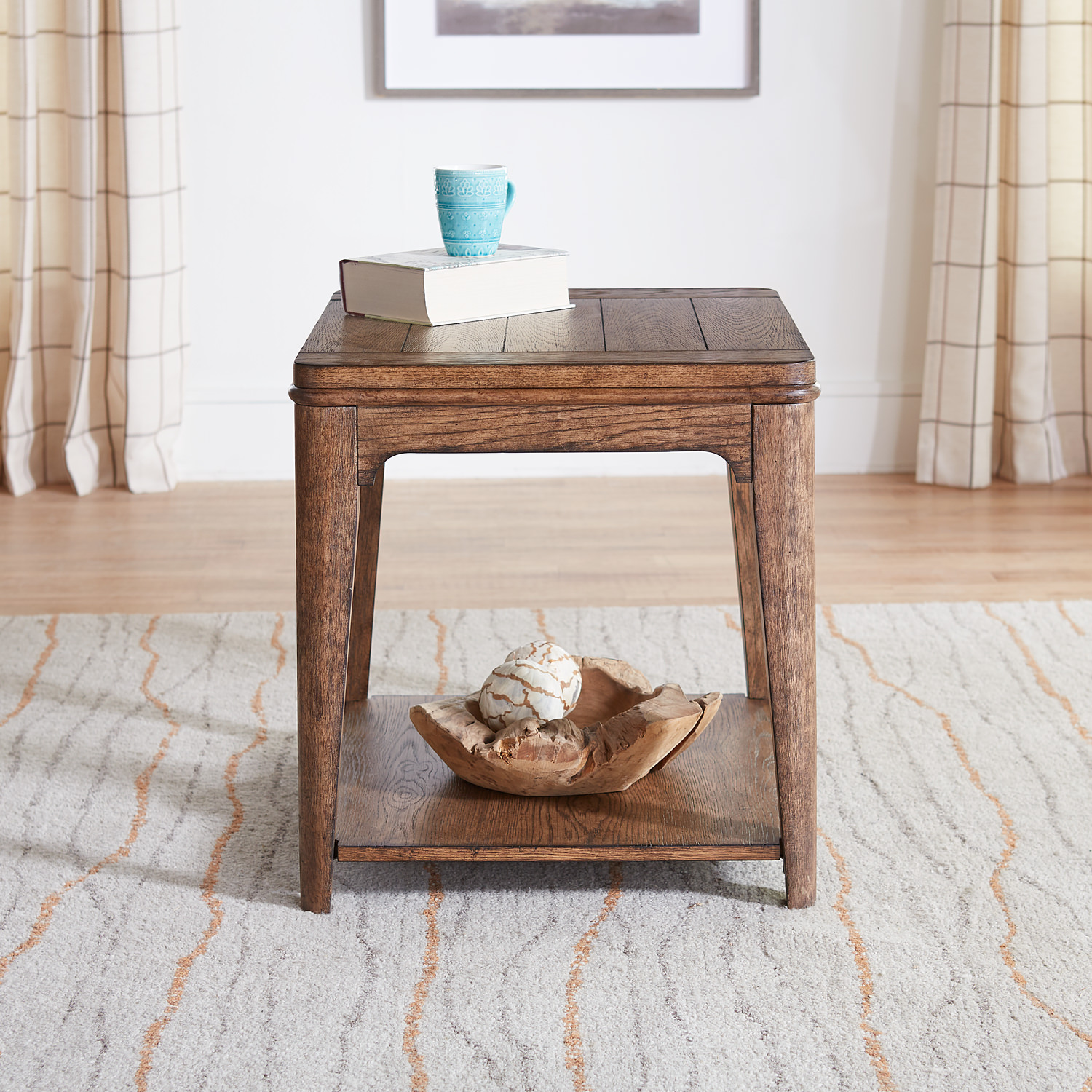 view storesThe Comet End Table is crafted with excellent rubberwood solids and cathedral white oak veneers, in a soft Sienna finish. The table has a planked top and tapered legs with a softly rounded edge for a modern feel. Bead molding along the apron adds a softened, versatile look. The open bottom shelf is perfect for extra storage. The Comet End Table is a modern take on a rustic style.
