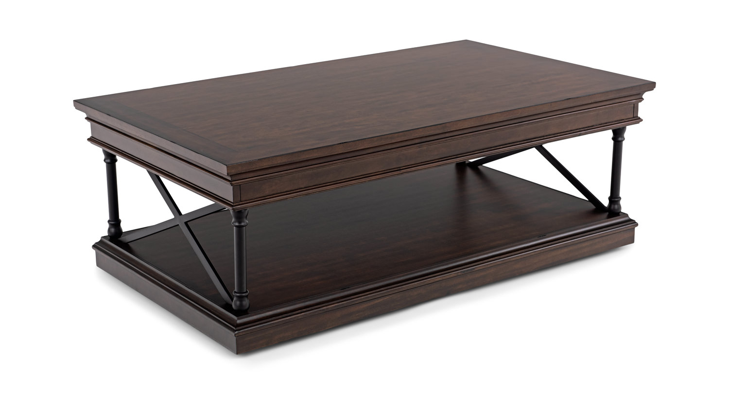 This Eloise Coffee Table is the centerpiece of any living room. It features a beautiful blend of poplar solids and birch veneers, with x metal accents for added style. This castered coffee table also features an open bottom shelf, providing ample storage and display space for your favorite items. The design is sure to be a statement piece in your home.