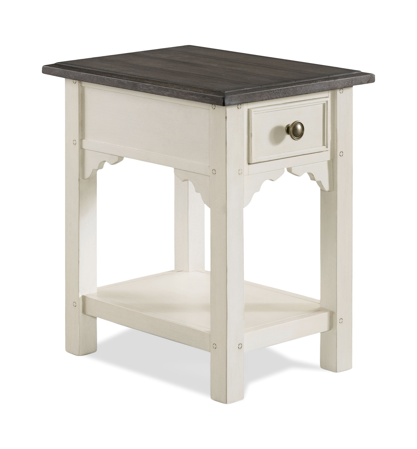 The Grand Haven Occasional Table collection is a charming cottage mix of painted and gently weathered surfaces, a collection evocative of family furnishings gently loved from one generation to the next. Crafted from hardwood solids and paint-grade ash wood veneers. Hallmarks of the Grand Haven Chairside Table include a Feathered White finish paired with planked and chiseled charcoal tops and bracket supports reminiscent of gingerbread on a picturesque wrap-around porch. A functional, dovetailed storage drawer and lower display shelf add sturdiness and necessity to the grandeur of the group, while hidden casters make for easy mobility. Some customer assembly required.