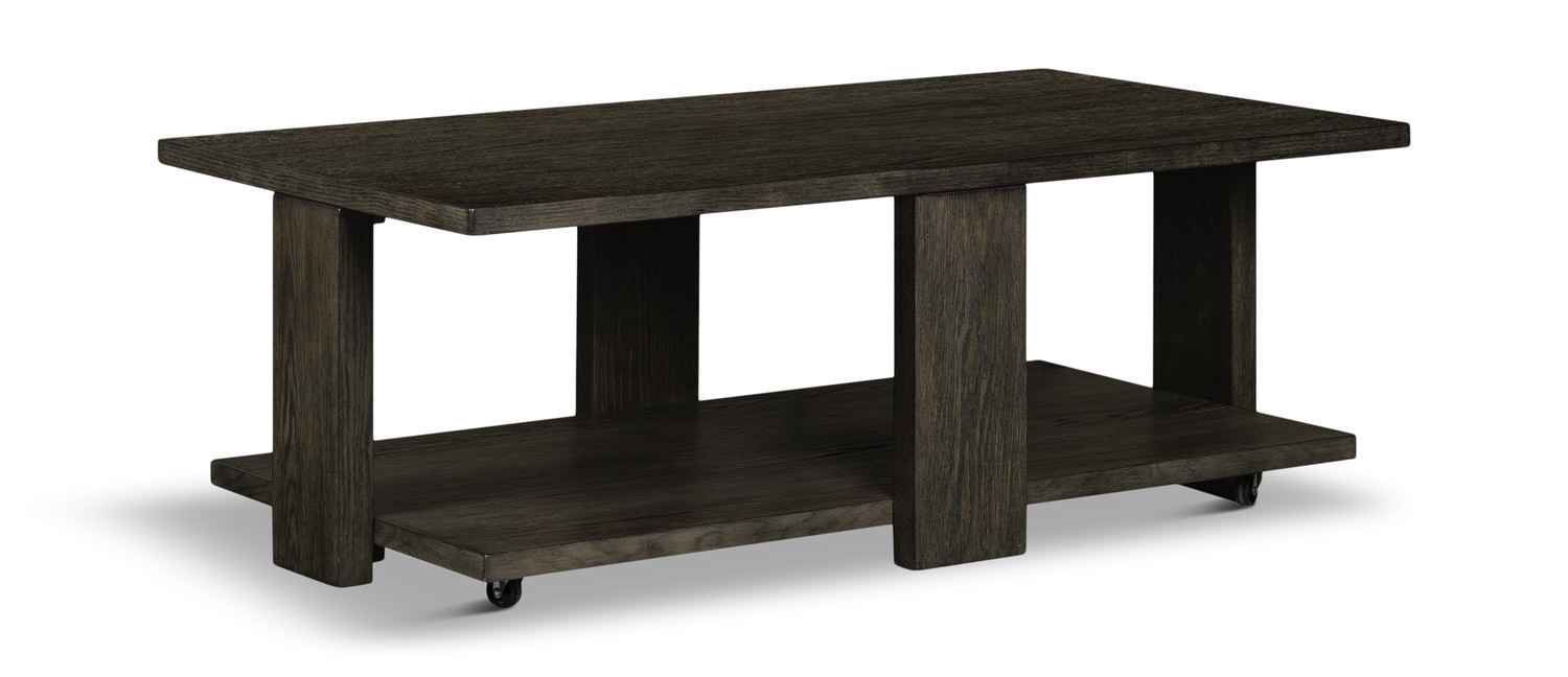 Introducing the Helix Coffee Table from HOM Furniture - where style meets functionality! Crafted a durable rubberwood solids and split heart white oak veneers, this table is perfect for displaying your favorite books or decor pieces. The wide square block legs not only provide stability but also add a modern touch to your living space. Designed for convenience, the Helix Coffee Table comes with casters for easy mobility, allowing you to rearrange your room effortlessly. The dark espresso finish complements the brown color, adding a touch of sophistication to any room.