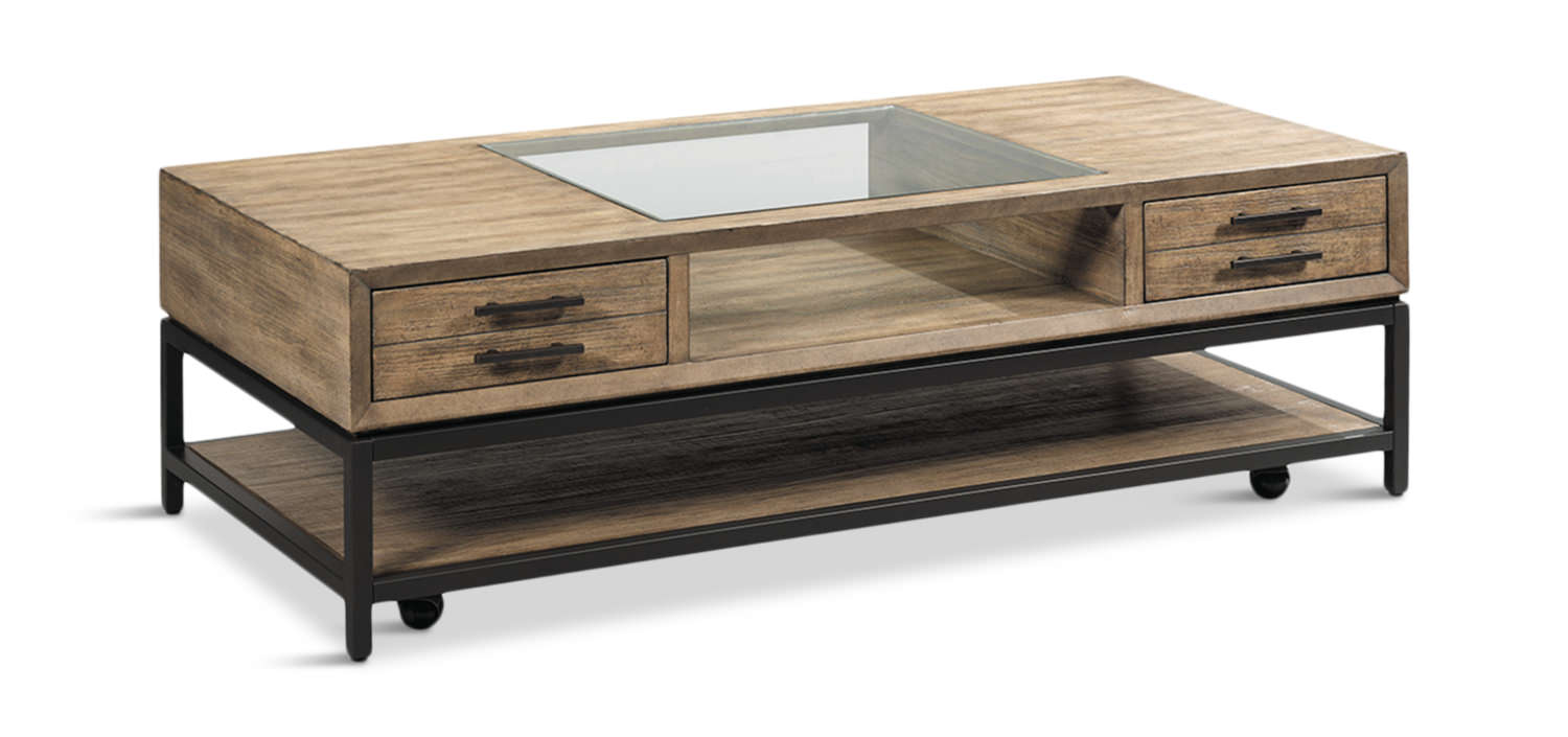 The Jefferson Coffee Table is crafted of thick poplar vneers, metal, and soft-close drawers with high distressing that are hand rubbed in a rich, natural waxed beige wood finish with hints of grey. Metal hardware and base are coated with a dark bronze finish. Jefferson is a fresh modern design with clean, straight lines and a tempered glass insert top. Functional, simple and incredibly versatile, Jefferson can coordinate with nearly any design style.