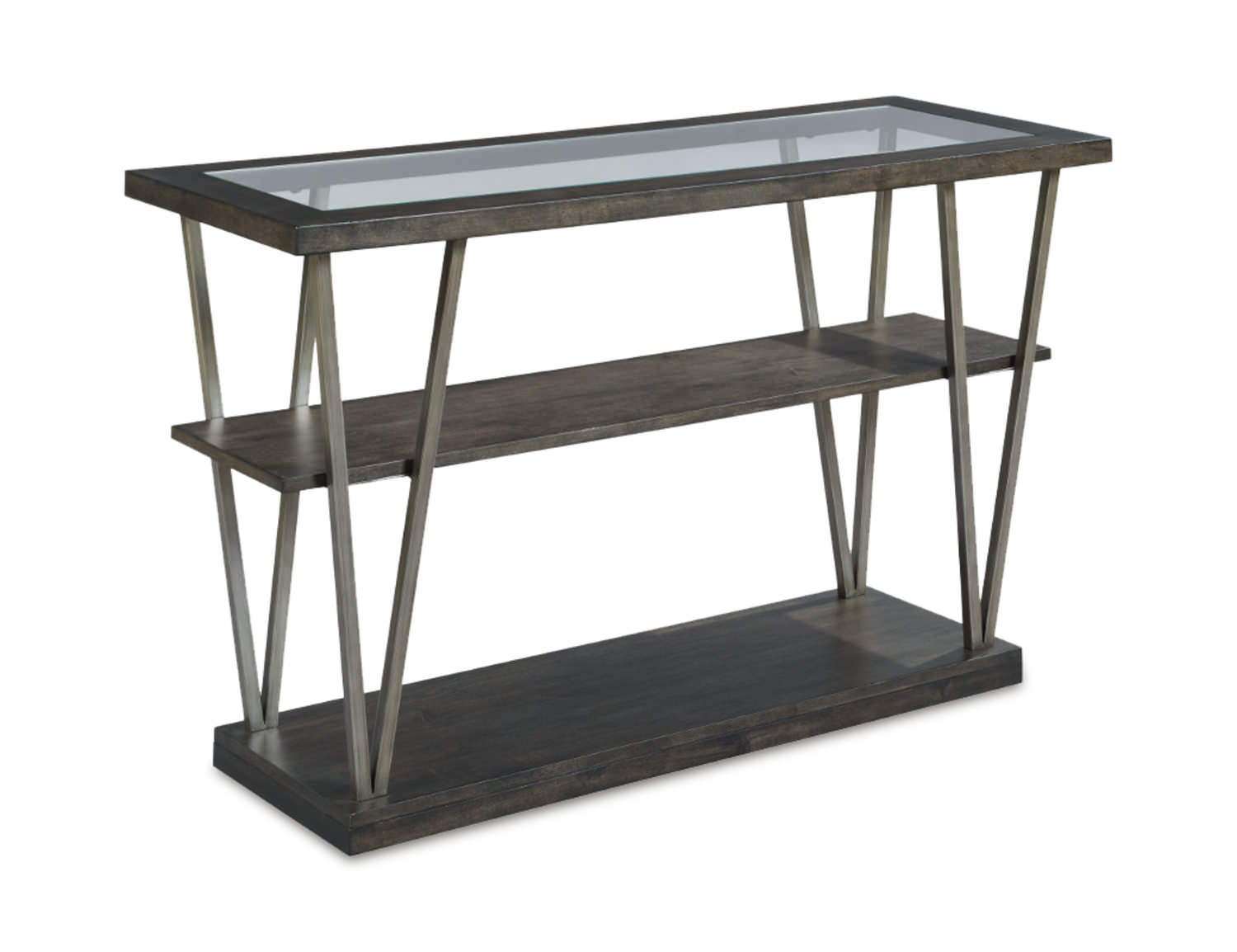 The Jupiter Sofa Table uses architectural and geographic shapes to create a contemporary collection that tempts the eye. The elegance of mixing materials shows through the well crafted maple veneer tops, tempered glass and metal bases. The Jupiter Sofa Table features a metal finish of glazed silver and a smoky brown wood finish that will make other living rooms envious.
