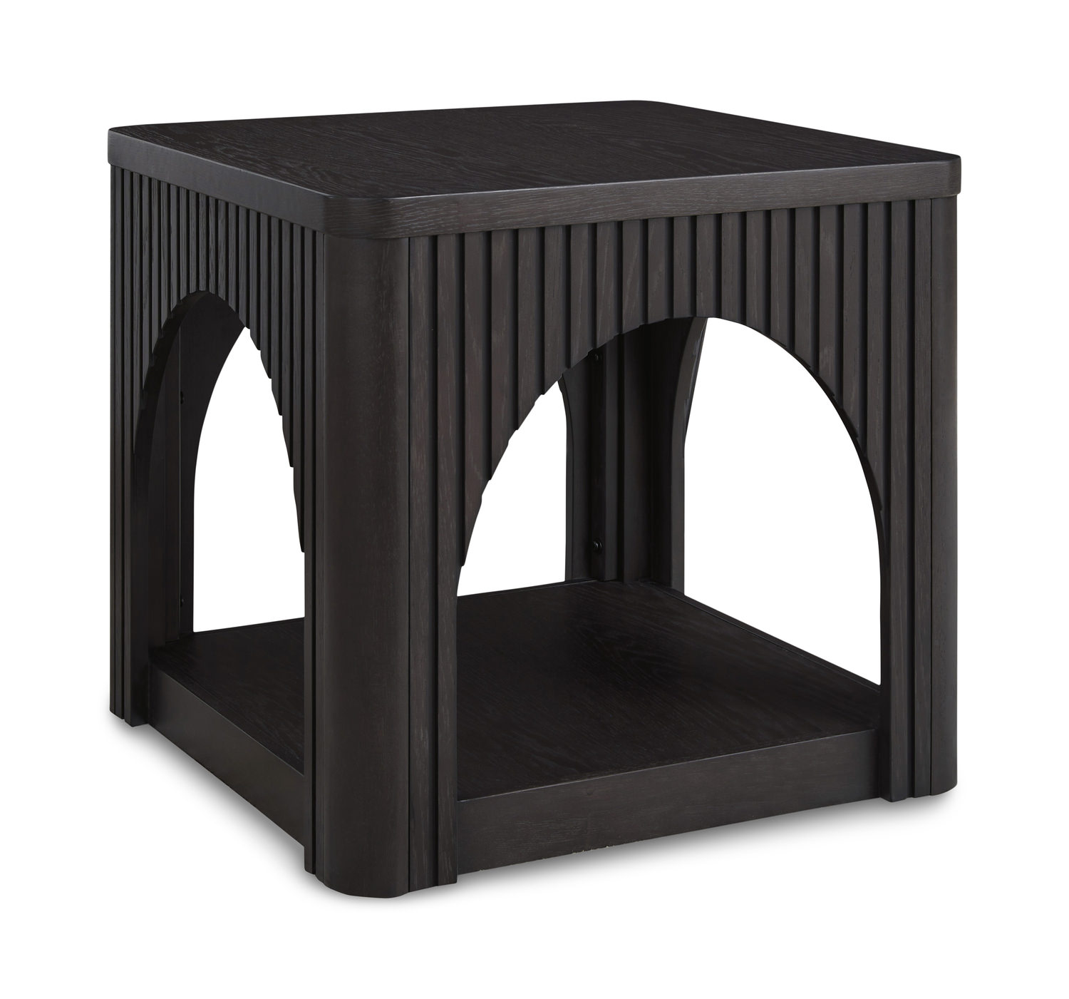 Looking to add a touch of sophistication and modern design to your living space? Look no further than the Kieran End Table from HOM Furniture! This architecturally designed masterpiece features unique arches and lattice details that will surely catch the eye of your guests. Made with a blend of hardwood, veneers, and MDF, this table boasts a beautiful dark black finish that exudes elegance. But wait, there's more! The Kieran End Table also comes with an open lower shelf that provides plenty of space for storage, making it not only a stylish addition to your home but a practical one too.