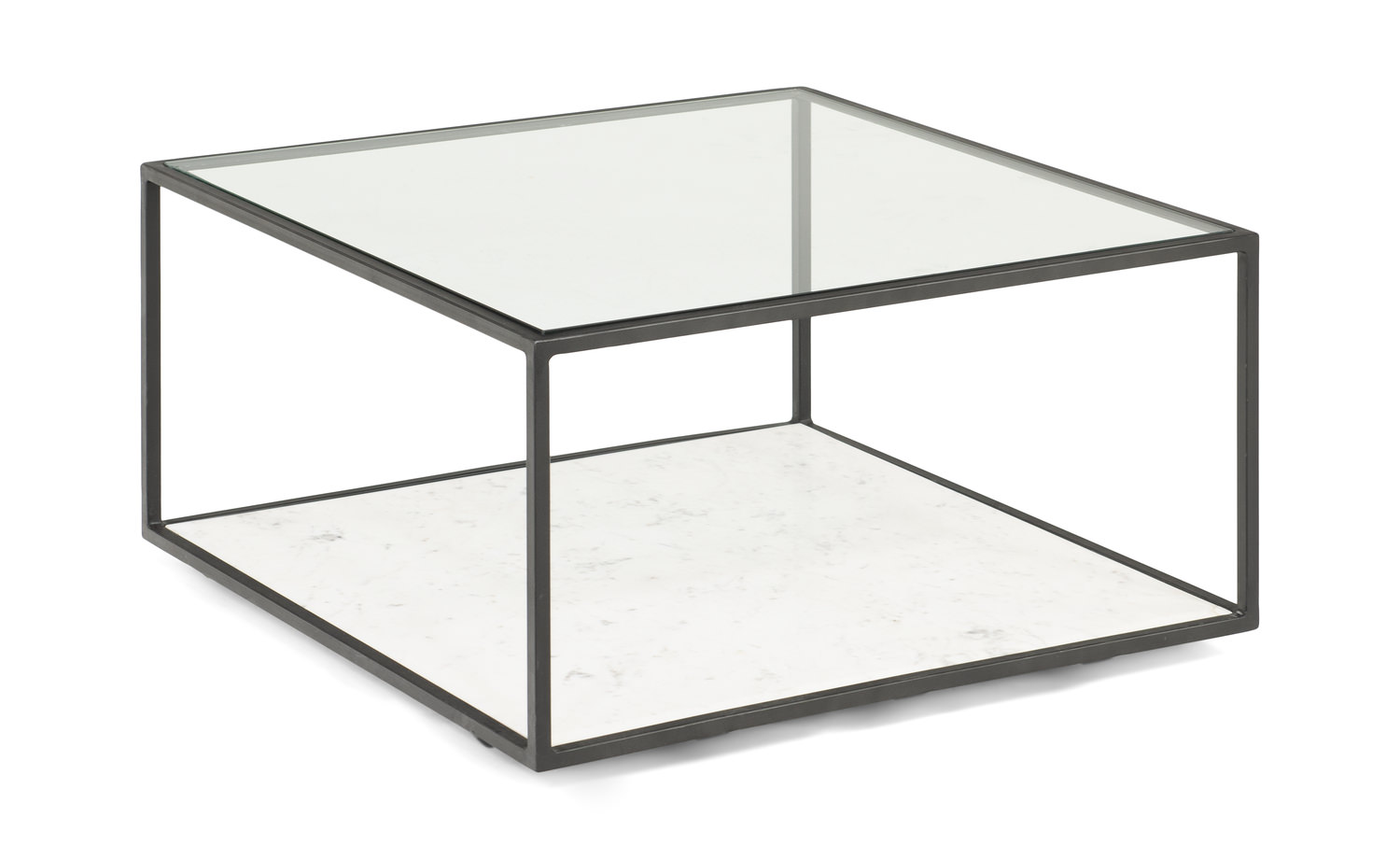 Bring home a minimal style with the Lincoln Coffee Table. This table is constructed with an iron frame in a gunmetal finish. The overall cube design has thin tubular steel to create a minimalist modern design. The bottom shelf is made with natural marble for an elegant touch. The top of the coffee table is a clear glass to show off the beautiful marble designs. This would be a perfect table to fit with your sectional.