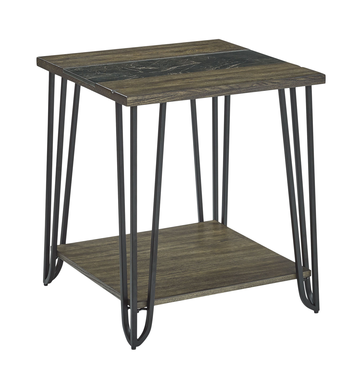 The Mendota End Table beautifully combines casual rustic charm with mid-century modern elegance. With a distressed dark driftwood finish and a striking inlay, this mixed-media gem can elevate any living space. Its canted loop iron legs bring a hint of retro flair, and the bottom shelf provides plenty of room for storage or display. As the perfect focal point for a contemporary living room that values both style and functionality, this table truly shines.
