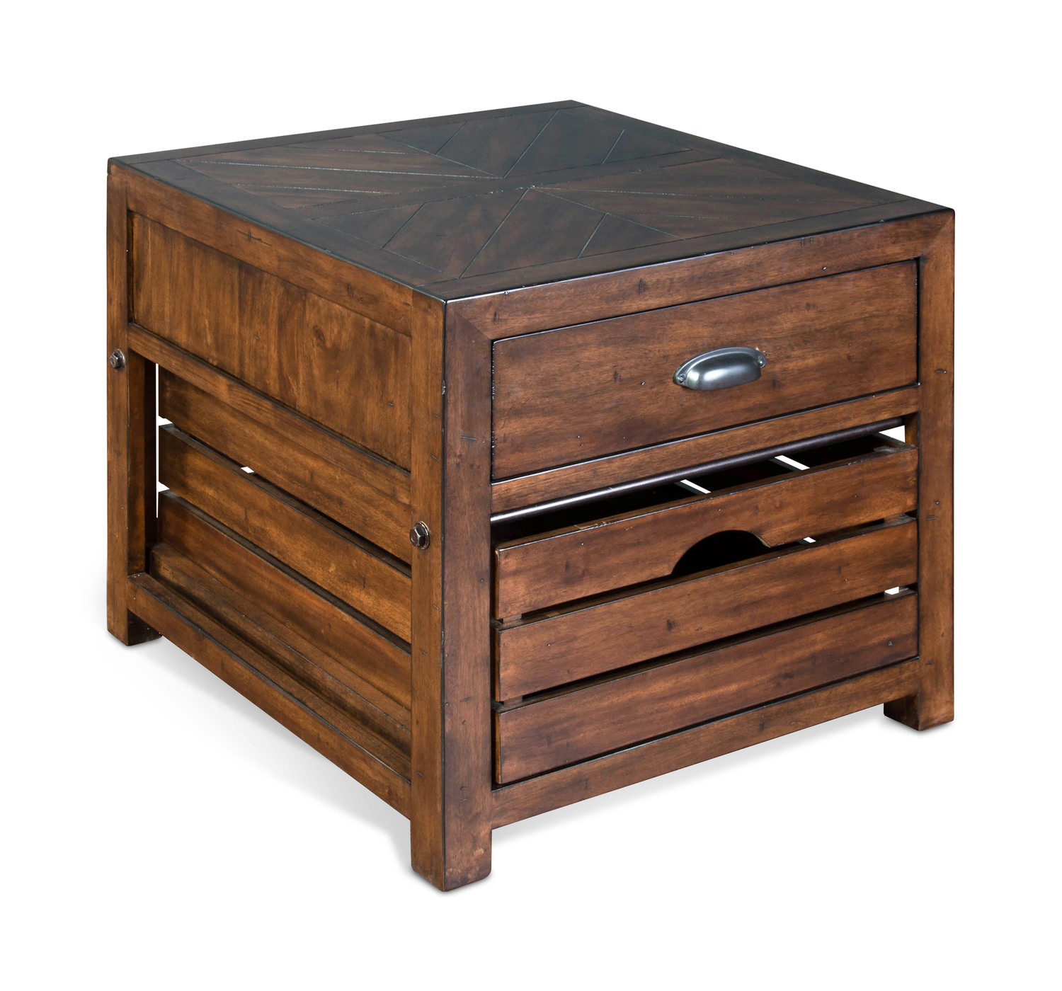 Constructed of mahogany solids and veneers, the Nevis End Table is solid and functional with ample storage space and loads of character. Top drawer features full extension drawer glides, while the additional storage crate is removable for your convenience. Antique cup style drawer pulls finish off the modern farmhouse appeal on this timeless classic.