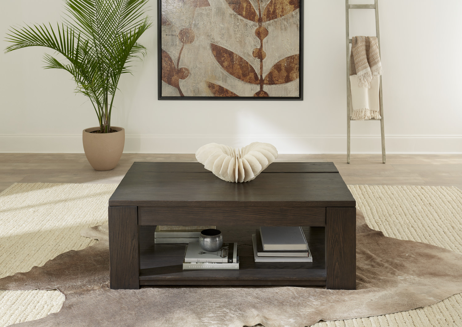 view storesUpgrade your living space with the Orlena Lift Top Coffee Table from HOM Furniture. Crafted from durable rubberwood solids and flat-cut white oak veneers, this coffee table boasts a distinctive Bark Finish that exudes elegance and charm. The overscaled exposed legs and nickel hardware add a touch of transitional style to the design, making it a perfect blend of comfort and sophistication. Featuring a lift top that has additional storage for your personal belongings. Bring a touch of timeless beauty to your home with the Orlena Lift Top Coffee Table by HOM Furniture.