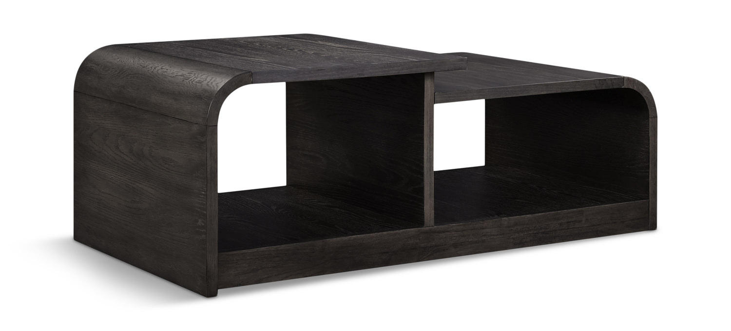 Discover the epitome of sophistication and style with the Paisley Coffee Table by HOM Furniture. This exquisite piece features a rounded waterfall edge and soft shaping, exuding a sense of luxury and elegance. Crafted from rubberwood solids and split heart white oak veneers, this coffee table boasts both durability and beauty. The modern design of the Paisley Coffee Table is complemented by its dark brown finish, adding a touch of class to any living space. With its open shelving and casters for easy mobility, this piece seamlessly blends design appeal with functionality, making it a must-have for those who appreciate both style and convenience.