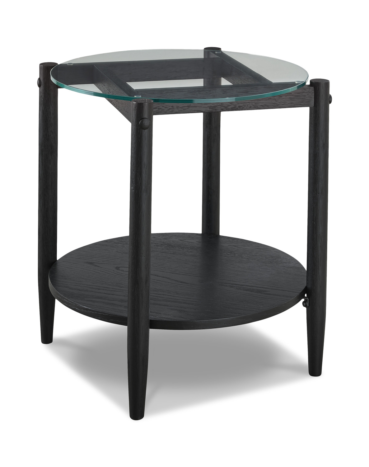 Welcome to the world of style and function with HOM Furniture's Phoebe End Table. This contemporary piece is sure to bring an adventurous vibe to your living room with its round, clear-tempered glass top and 6 interlocking legs in a cool design. An open shelf underneath gives you plenty of storage while the stylish black satin finish elevates your space with modern sophistication. Discover new possibilities today with the Phoebe End Table!