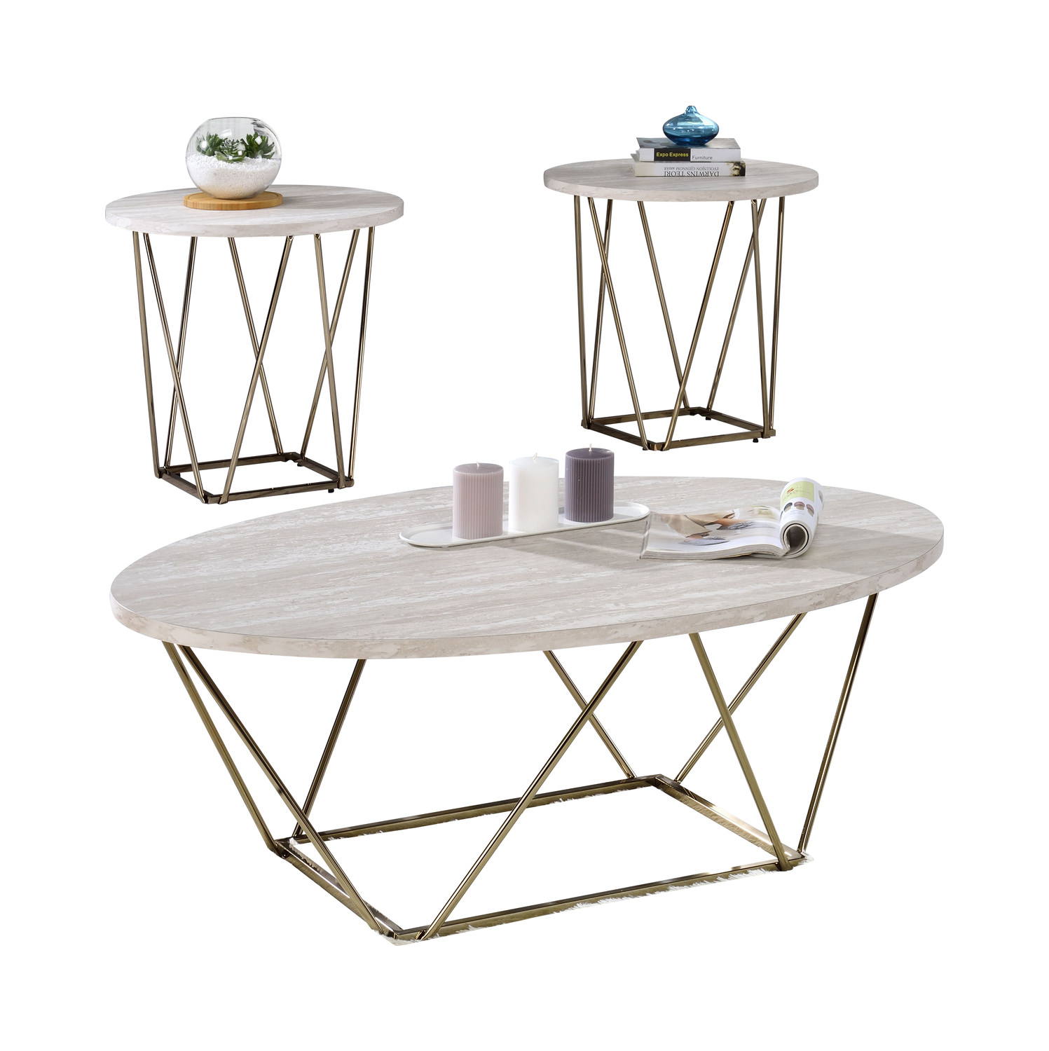 The Ruthie 3 Pack Table Group will provide a modern style to your room with its striking charm. Featuring a faux white marble top with a geometric base with a copper finish. The group comes with one coffee table and two end tables. This sleek and simple style will bring your room from dull to glam.