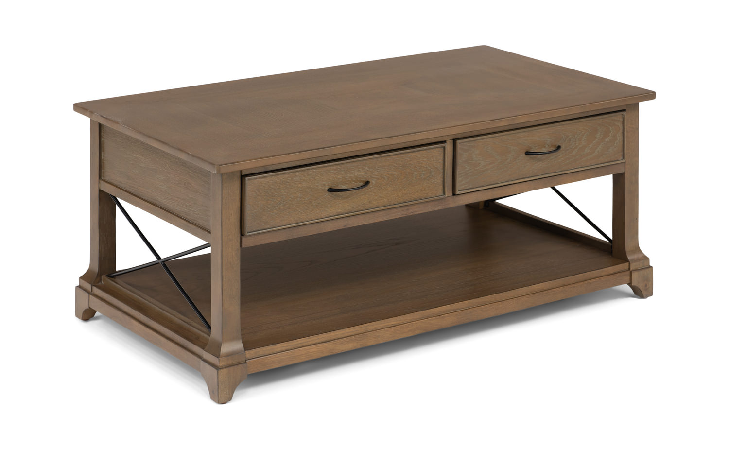 The Windhaven Coffee Table is a fine fit for a country cottage or modern farmhouse. Featuring a clean-lined silhouette with a decorative top with a diamond pattern. Made of hardwood and oak veneer with dovetail joinery. The drawers have a wood on wood glide and black hardware. The table also comes with casters for easy mobility plus two drawers and a stationary shelf for plenty of storage.