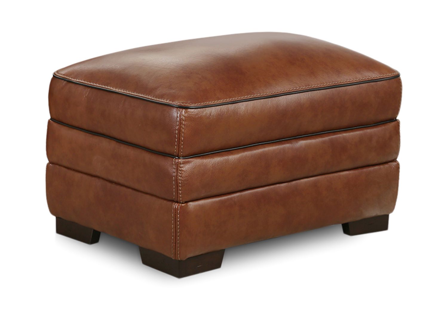 Introducing the Bauer Leather Ottoman, a masterpiece of luxury and comfort brought to you by Thomas Cole Designs. Crafted with 100% genuine leather, this ottoman is part of the Bauer Collection that exudes elegance and sophistication in every detail. The engineered hardwood frame ensures durability and longevity, while the high-resiliency foam with feather blend topper seating offers a plush and inviting feel. Not just a Leather collection, but a statement piece for your living space, the Bauer Leather Collection boasts a fully padded frame for added comfort and support. Whether you're entertaining guests or lounging on a quiet evening, this ottoman can be paired with the matching Bauer chair to provide the perfect combination of style and relaxation.