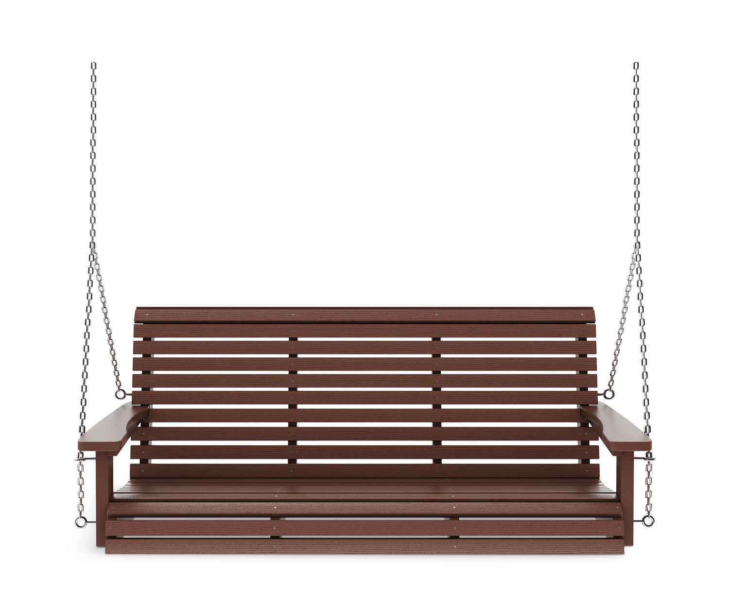 Welcome to the great outdoors with the 60" Traditional Porch Swing. Crafted in a charming pecan color, this swing is not only stylish but also eco-friendly, made from 100% recycled plastic. Say goodbye to worrying about fading, rotting, or splintering - this swing is built to last with UV stabilizers to keep it looking like new. Proudly made in the USA, this swing invites you to relax and unwind in your outdoor space. Custom orders are welcome, allowing you to personalize your swing to fit your unique style.