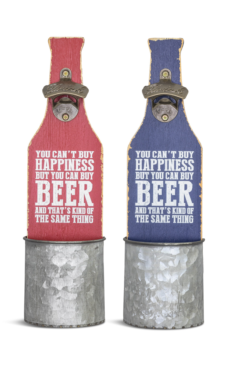There are two colors for you to choose from, red and navy blue! The bottle shape is made of wood and colored with oil paint and chipped paint on the edges to make a rustic look. It has a metal bottle cap opener and a rustic bucket basket to collect all beer caps! They would make a great gift for any beer lover! Each sold separately.