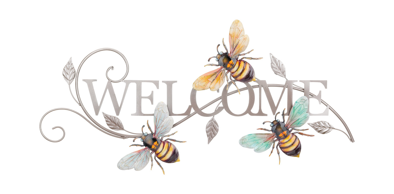 The elegant detailed silver "Welcome" sign has bumblebees with different colored wings. The steel frame with a painted finish needs to be in a covered space for long-lasting enjoyment.