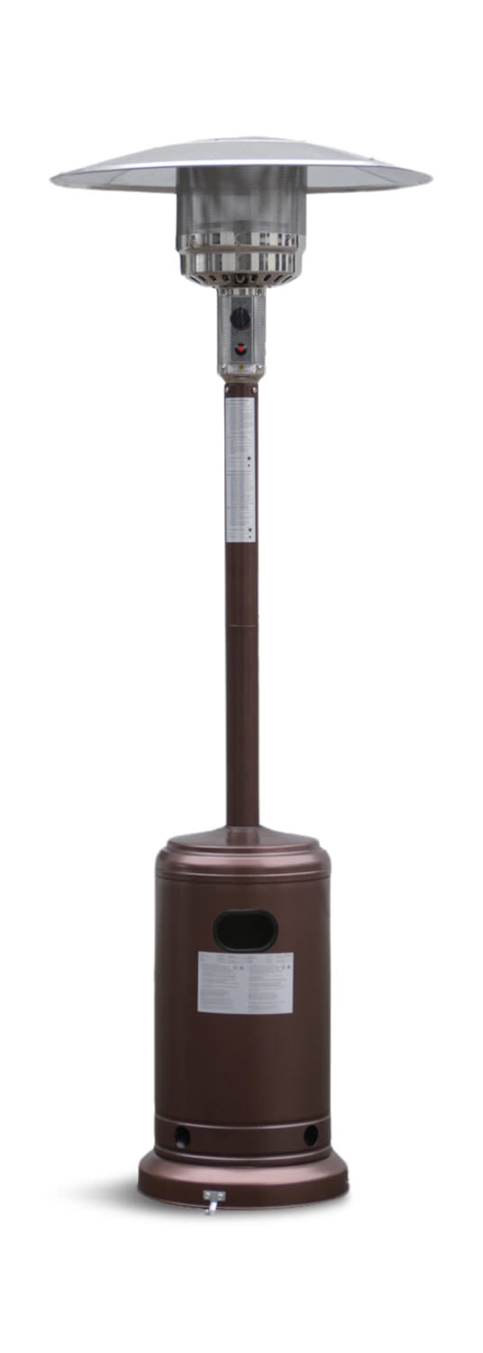 With needed warmth in the early or late season up in the Midwest, the Breeze Patio Heater provides 25 sq. ft. of heat up to 48,000 BTU's. The large top reflector provides better heat distribution and the temperature knob allows the heat output. The gas patio heater is finished in a hammered bronze color. Uses a standard 20 lb propane tank (sold separately). Safety is important, if the heater is tipped over the flow of gas to the burner will automatically shut off.