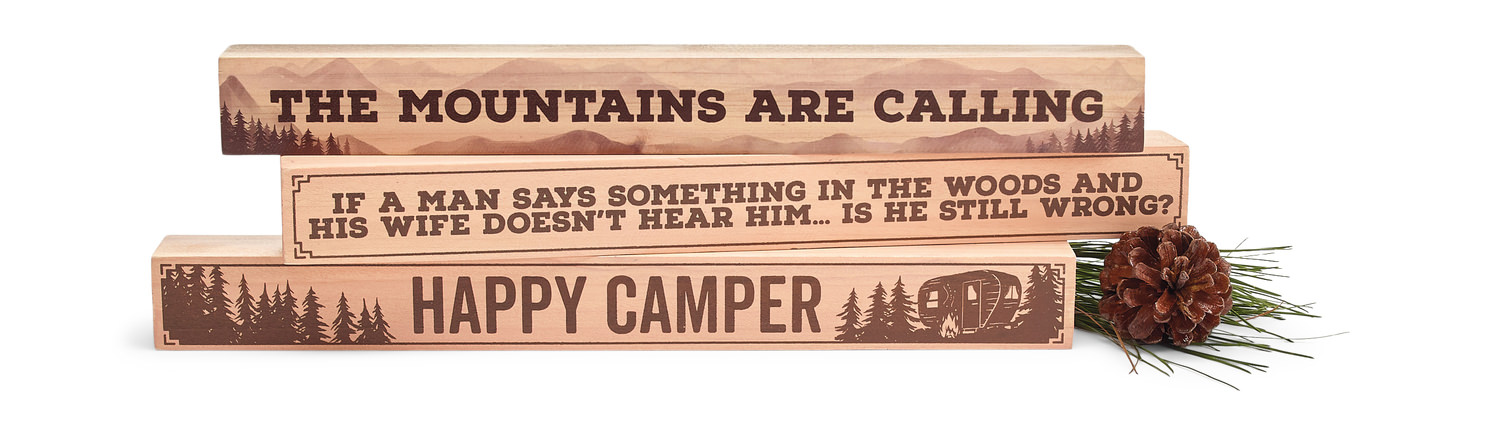 Decorate your home, RV, camper or cabin with a variety of Camping Shelf Sitters. Choose one or all, "Happy Camper", "The Mountains Are Calling", or "If A Man Says Something In The Woods...". Each sold separately.