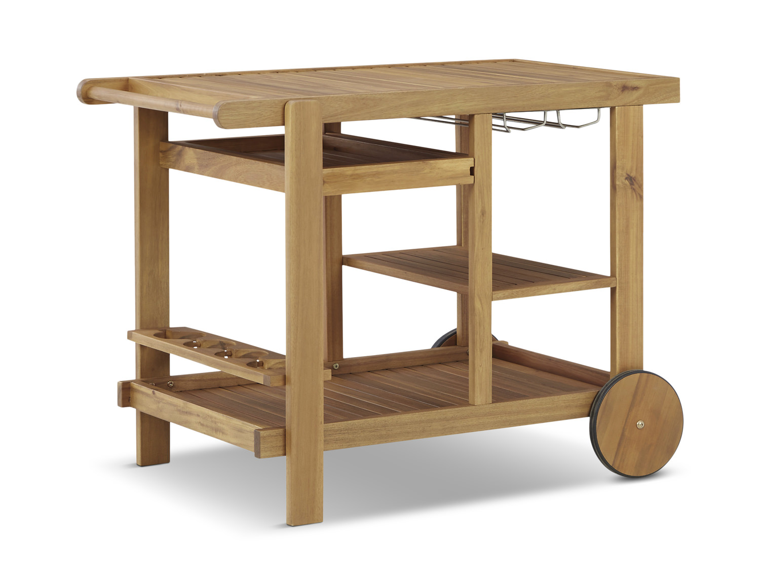 Making a splash by the pool, or entertaining guests, the Kailani Serving Cart features smooth-gliding wheels and a protective bottle holder. Its trendy design is decidedly modern, with slat-style trays that are as pretty as they are practical. One tray even slides out to help serve your guests.