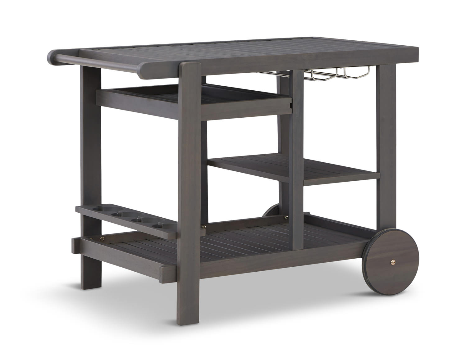Making a splash by the pool, or entertaining guests, the Kailani Serving Cart features smooth-gliding wheels and a protective bottle holder. Its trendy design is decidedly modern, with slat-style trays that are as pretty as they are practical. One tray even slides out to help serve your guests.