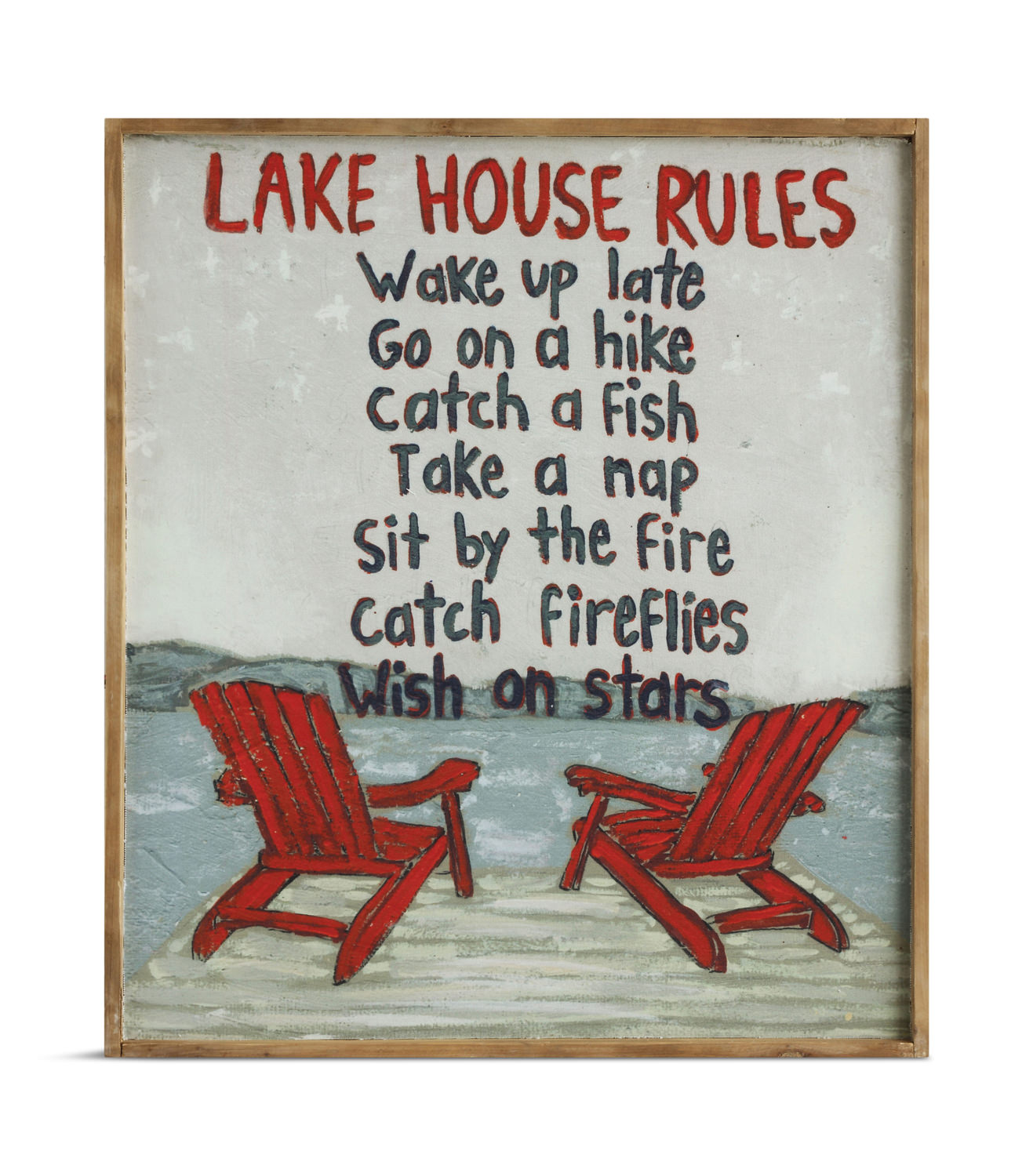 Decorate your cabin or lake house with wall art, and the rules of the house. Enjoy the colorful red adirondack chairs on the dock watching the water splish splash while ready the house rules. Measures 32" wide by 28" high.