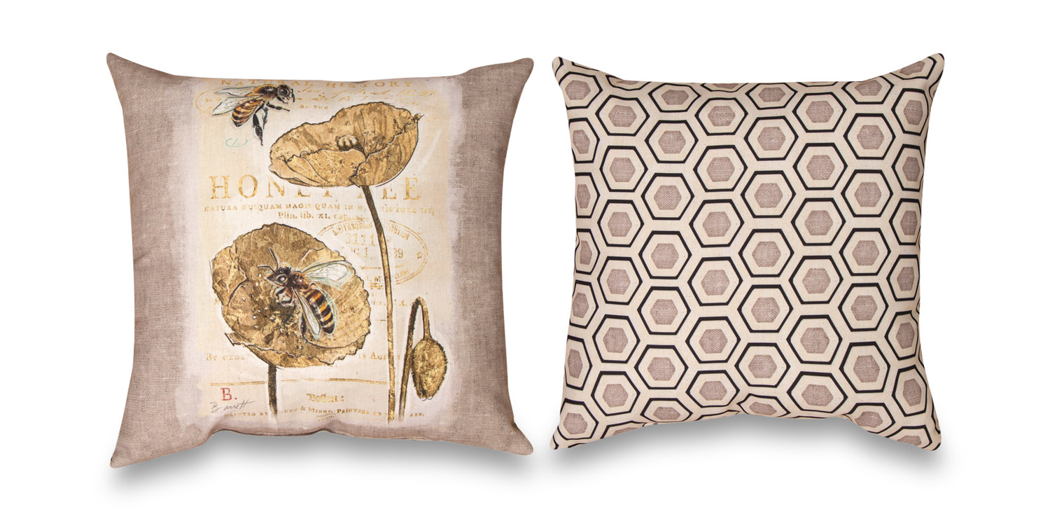 This printed on fabric pillow has a reproduction print titled "Natural LIfe Bee Honey" by Chad Barret/Art in Motion. Great for both decorating inside or out. 18" x 18" size for use on the porch, deck, patio or indoors.