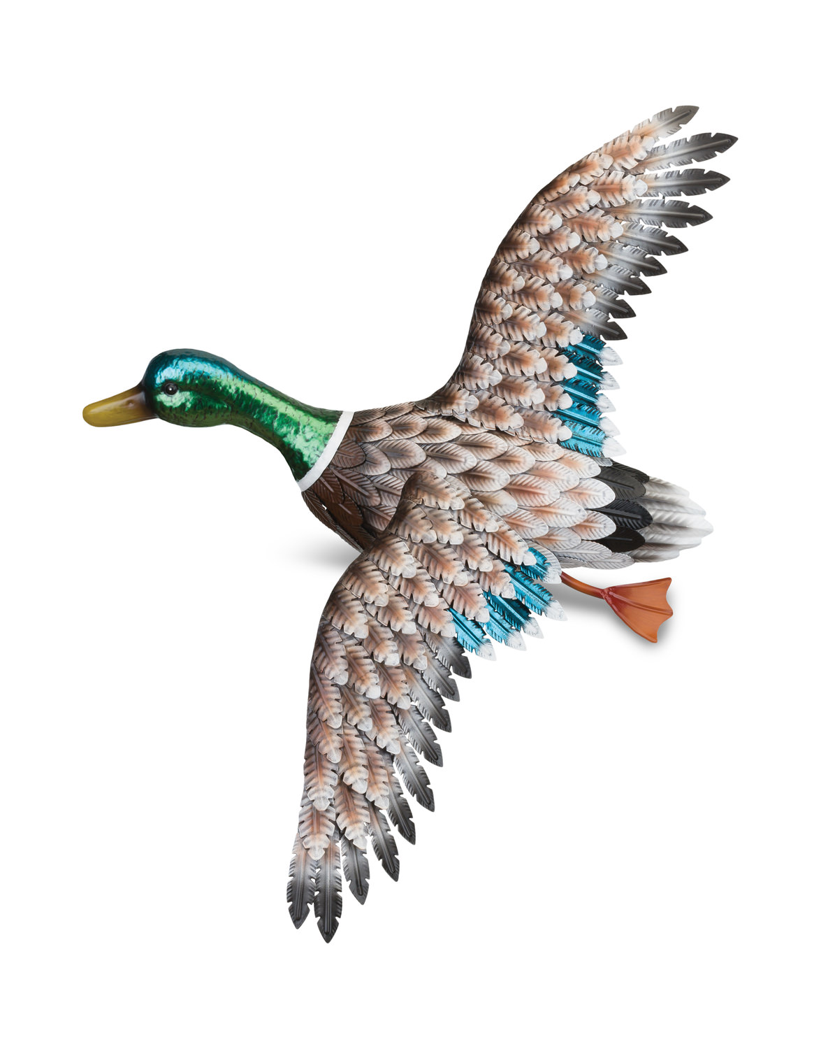 This large mallard with his wings spread wide open has a 3-dimensional look with realistic coloring and handcrafted feather detail for eye-catching beauty. A powder-coated finish makes it perfect for indoor and any outdoor covered space.