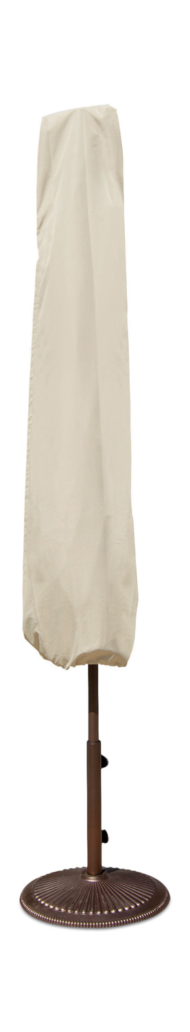 Protect the investment in a patio umbrella with a protective patio furniture cover for umbrellas. The large cover works for: 6.5' to 8.5' diameter patio/market umbrella styles. The design protects against excess umbrella fabric fading, keeping the umbrella dry and clean. Zipper closure with a high reach rod to allow for coverage without having to remove umbrella from base or stand. Made from Treasure Garden RinoWeave® fabric, designed to be durable, breathable and water resistant. Holds up better than vinyl cover to that crack or peel. One year limited warranty. Available in neutral champagne color. Additional protective cover options are available in-stock or special order, sold separately. See a porch & patio sales specialist for details.