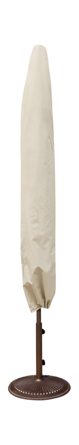 Protect the investment in a patio umbrella with a protective patio furniture cover for umbrellas. The large cover works for: 6.5' to 8.5' diameter patio/market umbrella styles. The design protects against excess umbrella fabric fading, keeping the umbrella dry and clean. Zipper closure with a high reach rod to allow for coverage without having to remove umbrella from base or stand. Made from Treasure Garden RinoWeave® fabric, designed to be durable, breathable and water resistant. Holds up better than vinyl cover to that crack or peel. One year limited warranty. Available in neutral champagne color. Additional protective cover options are available in-stock or special order, sold separately. See a porch & patio sales specialist for details.