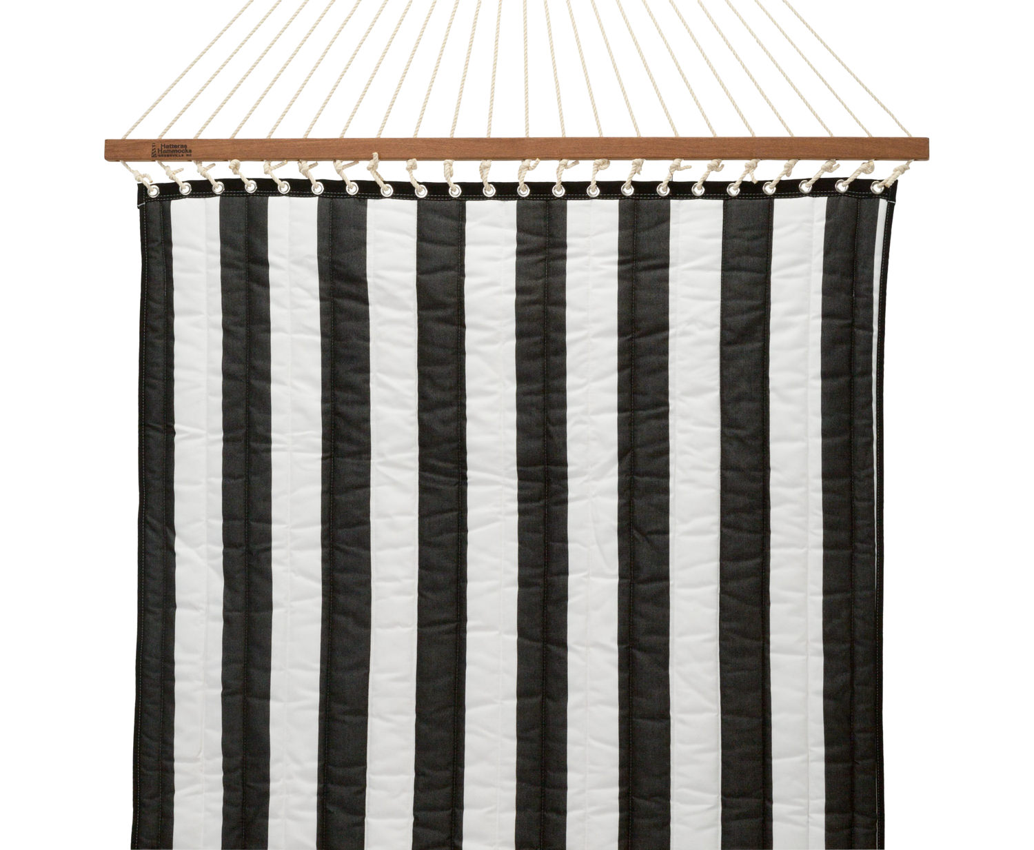 The Quilted Hammock is constructed of two layers of all-weather fabric sandwiching a plush layer of polyester filberfill batting. Hammock framed with two solid hardwood spreader bars. Chains and hanging hardware are rust-resistant zinc-plated steel. Available in a variety of fabric colors.