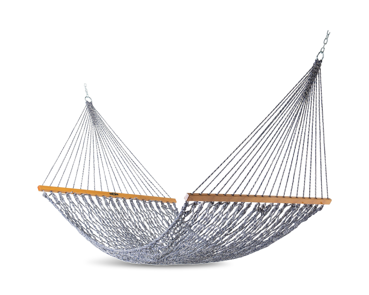 The Rope Hammock is hand woven of soft spun polyester three-ply twisted rope. The hammock is equipped with a hardwood spreader bar. Chains and hanging hardware are rust-resistant zinc-plated steel. Quilted hammocks and pillows are also available, along with a steel stand, storage bag, and tree straps, each sold separately.