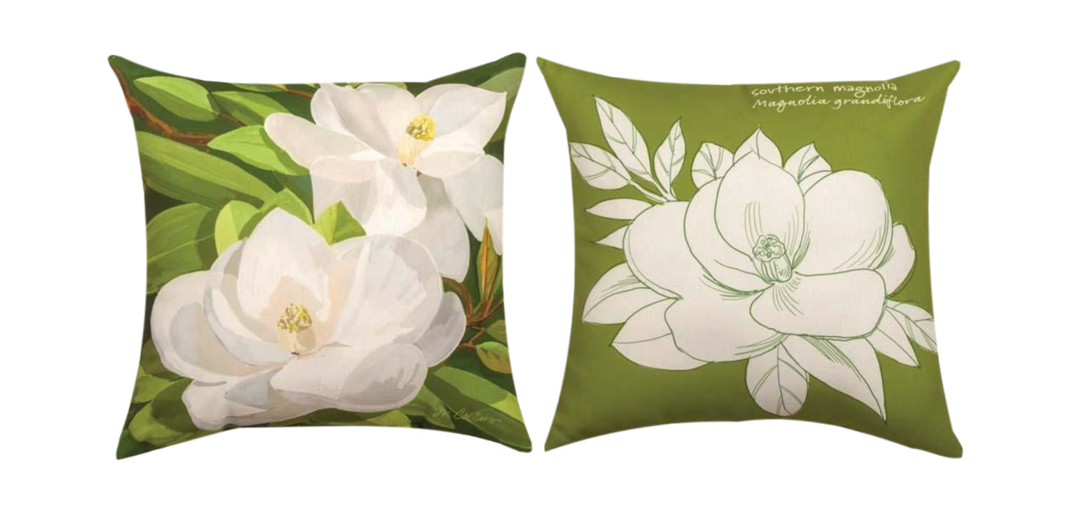 This Souther Magnolia 18" Pillow has a reproduction print titled "Southern Region Flowers" by Martha Collins. Crafted in Climaweave™ fabric, a product designed for four seasons of year round living inside or outside. Resistant to moisture and fading, this 18" x 18" pillow is perfect for use on the porch, deck, patio or indoors.