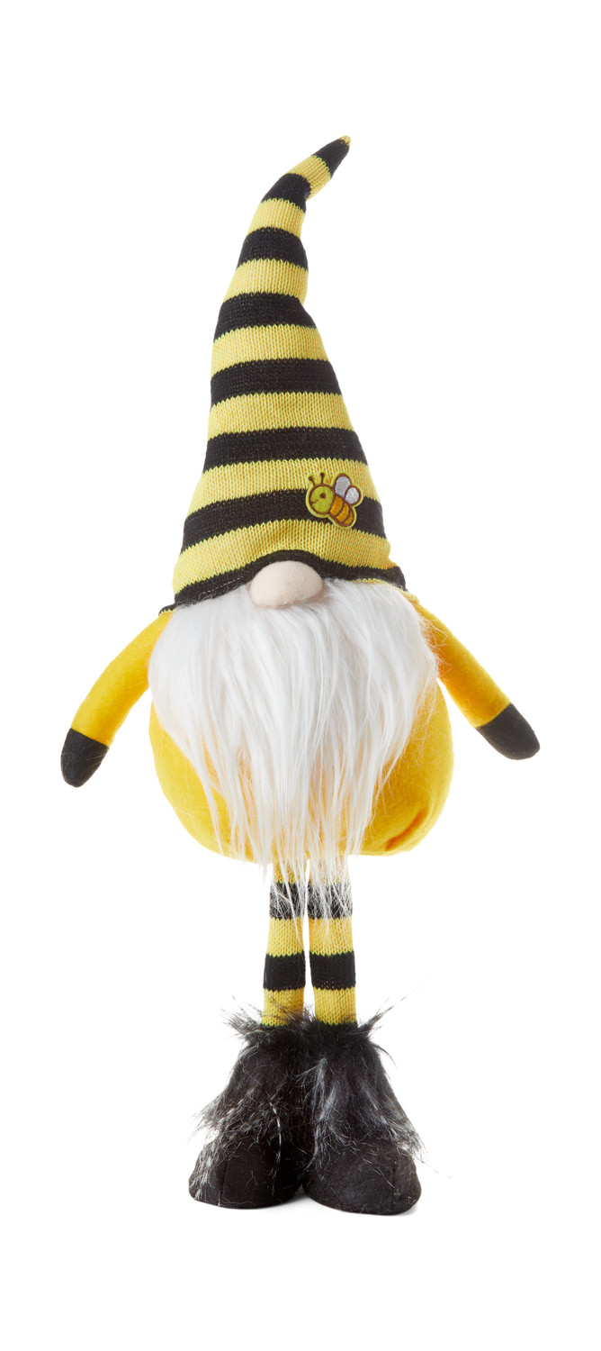 Buzz, buzz, enjoy this spring and summer with a Standing Bee Gnome for your home decor which is told to bring good luck. The yellow and black strip fabric with feather boots and white beard will look great in your entryway, porch, or family room. Stands 23" tall.
