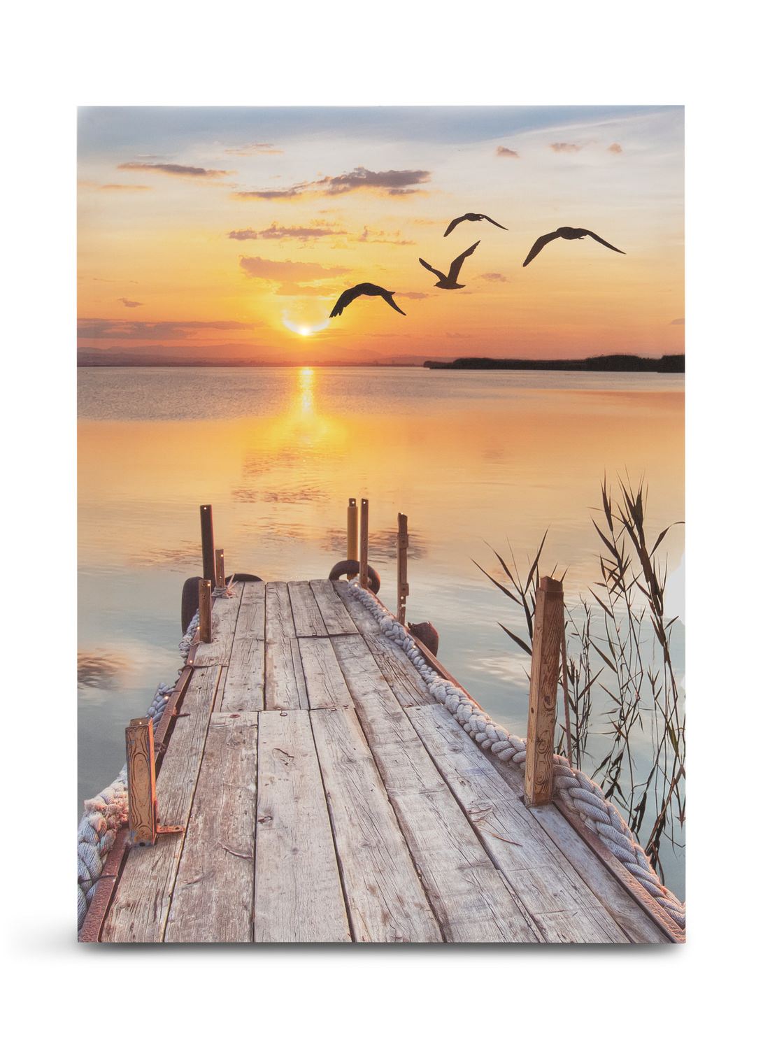 Imagine yourself sitting on the dock, dangling your feet in the lake and watching the seagulls fly over as the sun rises in the morning. Light up this art piece with 20 fiber lights to bring this environment to life. Requires 3AA batteries, not included.