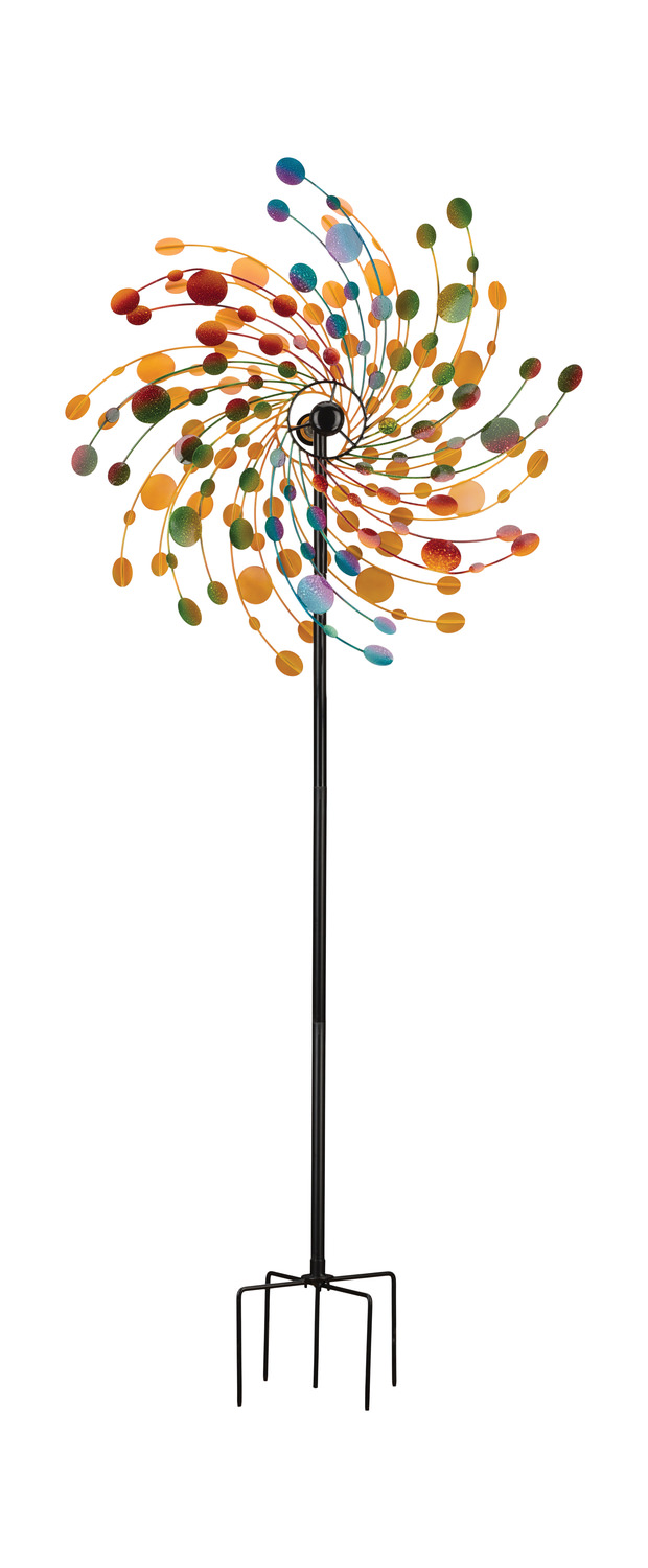 Add pizazz to your landscape with this large 32" Confetti Rotating wind spinner. The large back-to-back double spinners move in opposite directions creating a mesmerizing effect and have the added feature of rotating on the top of the stake to help the blades face the wind. Thick and strong five-pronged ground stakes.