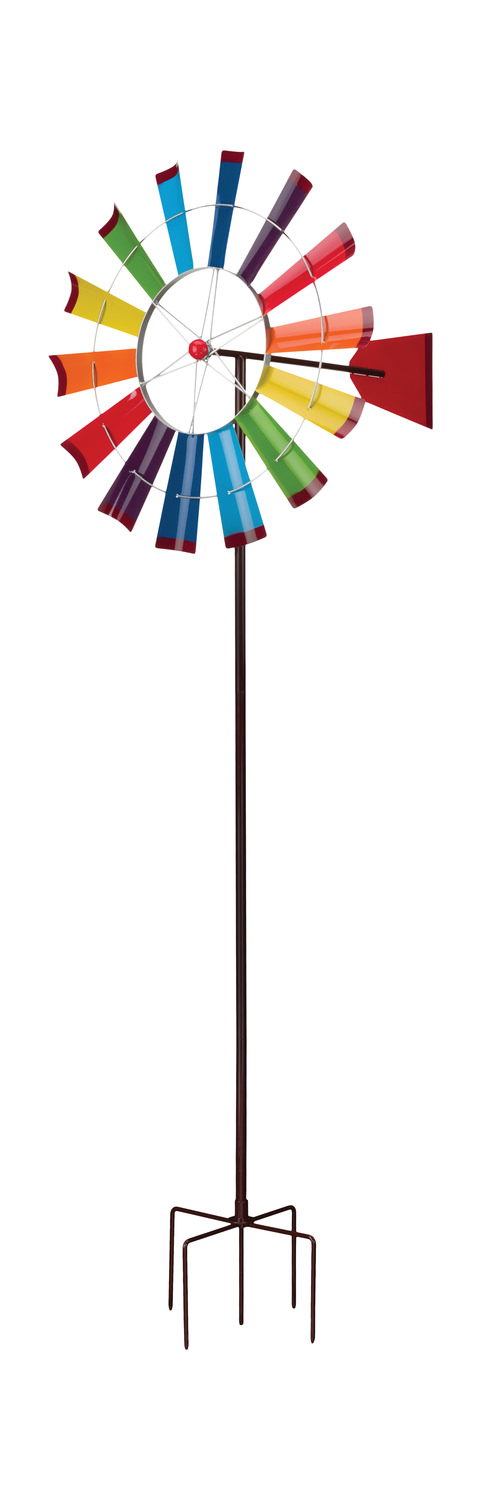 Add a splash of color to your flower garden or front lawn with this vintage-inspired windmill wind spinner. The rear blades rotate the front spinner into the wind, causing a rainbow of hues! It's made of a durable metal material that allows it to withstand the windy and rain and has a 26" diameter. Comes with a sturdy five-pronged fork at the base to secure the spinner to the ground.