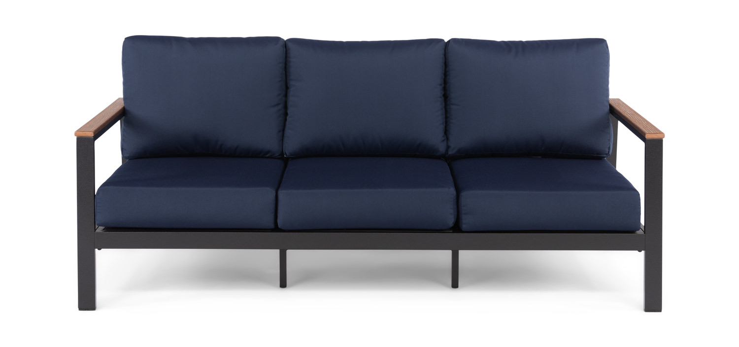 Upgrade your outdoor space with the Cityview Sofa. Crafted with a sturdy aluminum frame in a sleek midnight finish, this sofa features elegant arm rails in antique mahogany for a touch of classic charm. The durable fabric upholstery is not only stylish but also easy to maintain, ensuring long-lasting comfort. Choose from our stocked cushions or customize your own with a special order. Assembly is required. Don't forget the protective cover will keep your sofa looking as good as new for years to come.