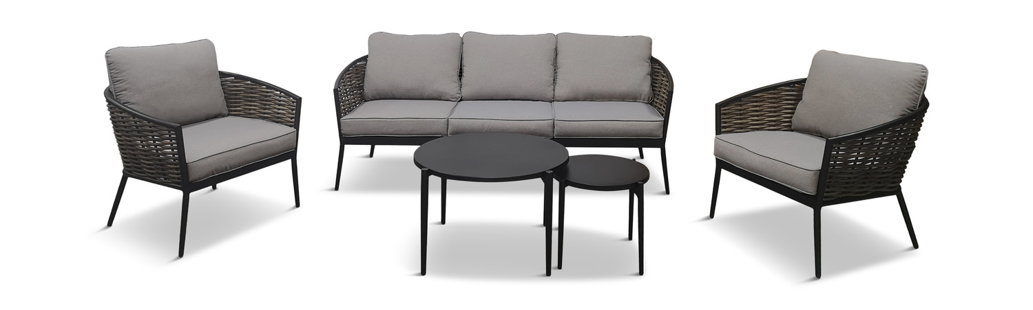 Furnish a porch, deck, or patio for entertaining or outdoor relaxing with the Emmett Collection by Furniture Creations Direct. The Emmett includes a sofa (77" x 29" x 29"), two club lounge chairs (31" x 29" x 29" each), a coffee table (27" diameter, round table -18.5" high), and an end table (15" diameter round, - 16" high). The Emmett's design is transitional and will provide a wonderful chat grouping that is easy to care for and durable (aluminum frame, powder coat finish, SunSeal acrylic fabric covered cushions). Assembly is required, this collection ships in one oversized carton. Seasonal items available online or shown at select showrooms in the patio department area.