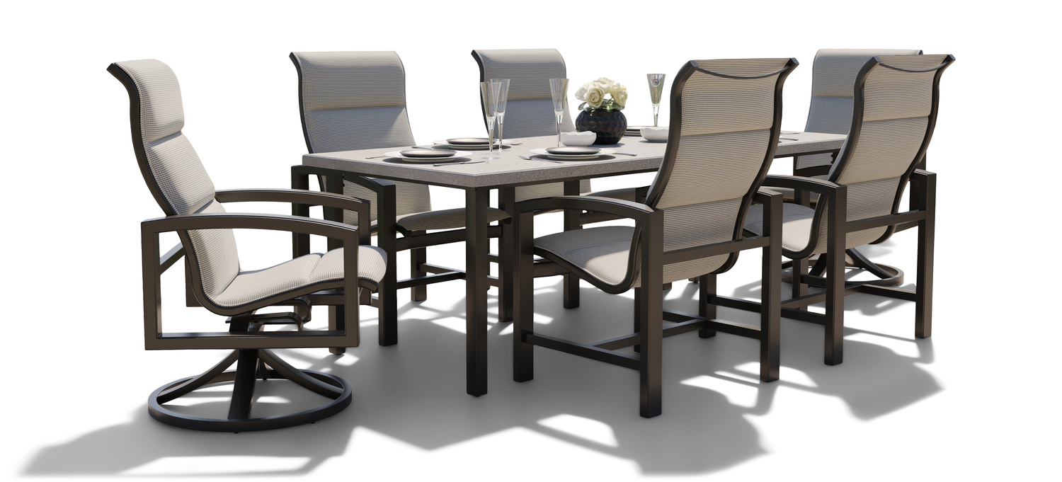 Commercial grade high back swivel rocker comfort from Tropitone, the Lakeside Collection. Transitional design for outdoor living, crafted in aluminum with both swivel and rocking design. The Lakeside Collection has ergonomic bends and curves to provide better back and seat comfort for not only outdoor dining but also for outdoor lounging use. The padded version adds a layer of quick-dry polyester padding that provides more comfort will dry quickly and is easy to keep clean. Lakeside swivel rockers and dining chairs are available individually (each) or can be paired with a variety of dining table choices to create a set as shown. A variety of frame and fabric options allow for a wide range of custom designs. Protect your investment with outdoor furniture covers available for each item or to cover the entire set, sold separately, see sales associate for details.